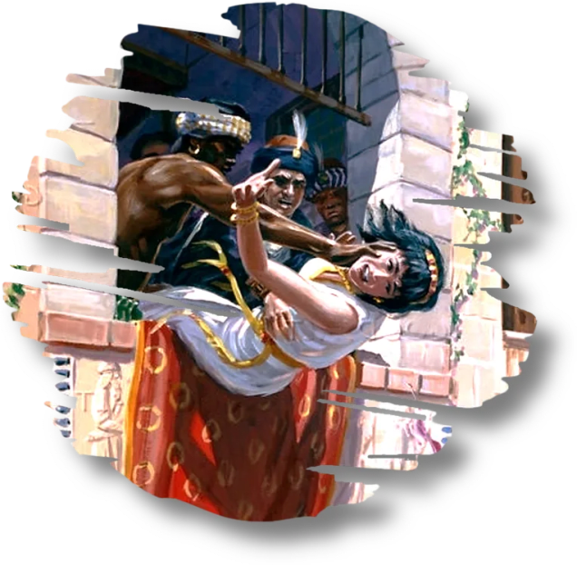 அப்பொழுது அவன்: அவளைக் கீழே தள்ளுங்கள் என்றான்; அப்படியே அவளைக் கீழே தள்ளினதினால், அவளுடைய இரத்தம் சுவரிலும் குதிரைகளிலும் தெறித்தது; அவன் அவளை மிதித்துக்கொண்டு,